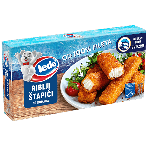 Riblji štapići napravljeni su od 100% fileta aljaške kolje. Nakon što ih filetiramo i oblikujemo, štapiće paniramo u hrskavim krušnim mrvicama s dodatkom začina za zlatno-žutu boju. Ovi hrskavi štapići bogati su proteinima, a osim toga izvor su vitamina B12 i Omega-3 masnih kiselina. Jednostavna i brza priprema u pećnici, tavi ili fritezi, ove štapiće čini idealnim obrokom za cijelu obitelj!