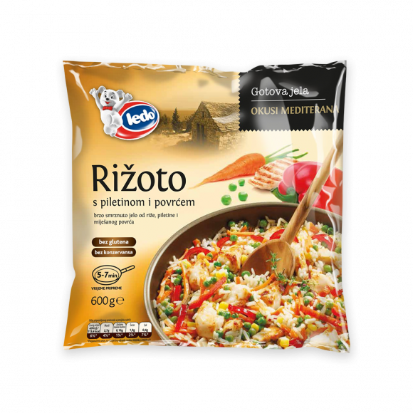 Okus mediterana prožima se u svakom zalogaju rižota, lagano začinjenog i spremnog za brzu i jednostavnu pripremu. Ukusan rižoto spravljen je od sočnih komadića piletine, zrna riže te hranjivog miješanog povrća mrkve, graška, paprike i kukuruza.