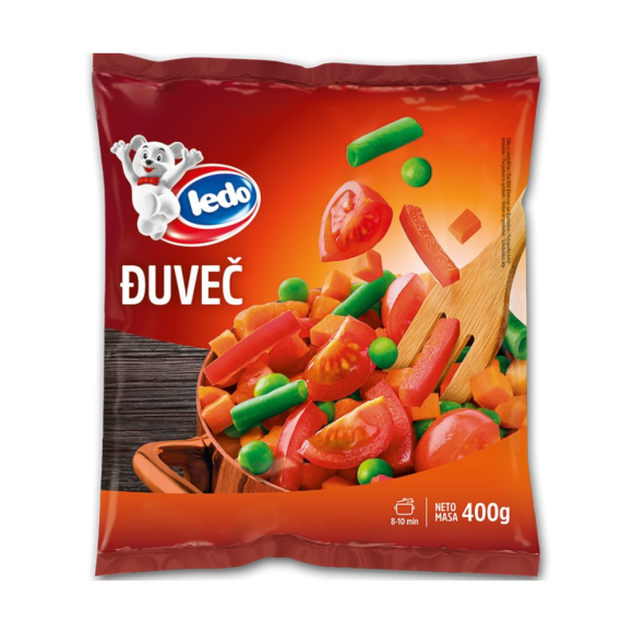 Ledo Đuveč sastoji se od crvene paprike, cijelih cherry rajčica, mrkve, graška i zelenih rezanih mahuna te je dostupan tijekom cijele godine. Odličan je za pripremu sočnog priloga s dodatkom riže uz mesna jela te se može koristiti za kuhanje različitih tjestenina ili povrtnih lasagna. Jednako tako olakšat će kuharicama posao i osloboditi ih dosadnog sjeckanja za pripremu variva ili bilo kojeg drugog jela bogatog povrćem.