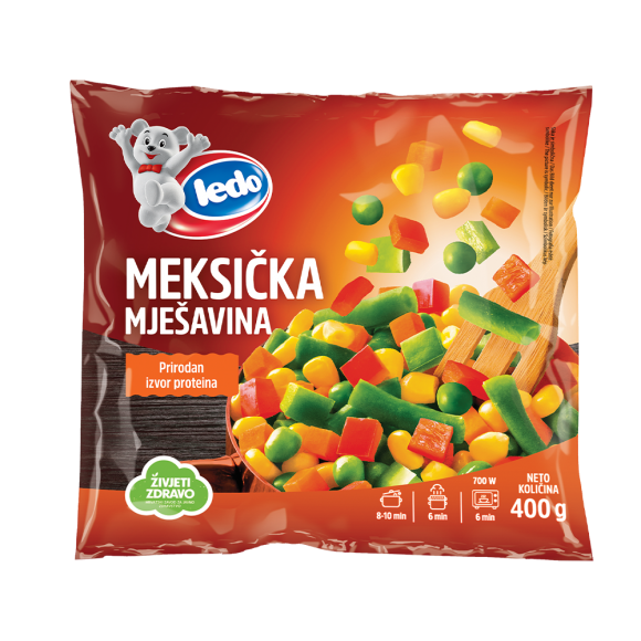 Ledo Meksička mješavina sastoji se od kukuruza šećerca, mrkve, graška, zelene mahune te crvene i zelene paprike.