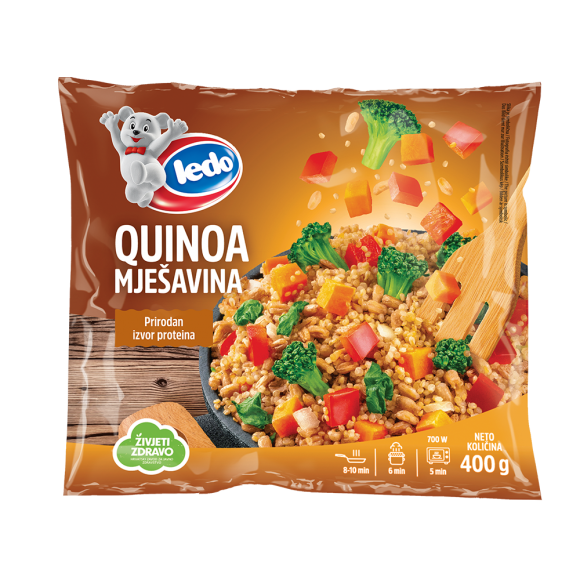 Ledo Quinoa mješavina sastoji se od quinoe, spelte i mješavine raznovrsnog povrća (brokule, crvena paprike, špinata, mrkve i crnog luka). Možete je brzo i lako pripremiti za samo 10 minuta i koristiti je kao dodatak jelima ili kao idealan samostalan obrok.