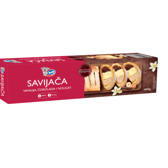 Savijaču izvadite iz kutije te je položite na lim i ostavite 30 minuta na sobnoj temperaturi kako bi se odmrznula. Odmrznutu savijaču stavite s limom u pećnicu i pecite u prethodno zagrijanoj pećnici oko 30 minuta pri temperaturi od 180°C stupnjeva. Po želji, možete ju poslužiti uz šećer u prahu, slatko tučeno vrhnje ili sladoled.