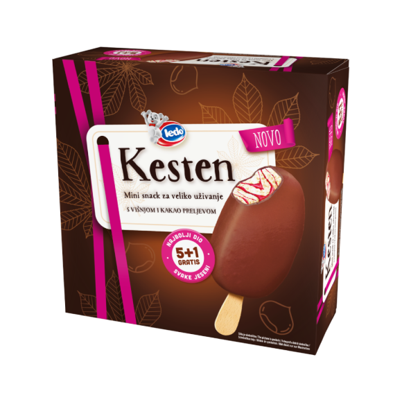 Kada bi jesen imala okus, bio bi to okus Ledo Kestena. Od sada svi ljubitelji ove vrhunske poslastice mogu uživati u Kestenu na štapiću, koji raskošni okus kestena upotpunjava unutarnjim prošaranim preljevom osvježavajuće višnje i hrskavim preljevom od kakaa. Otkrijte naše praktično multipack pakiranje sa šest štapića i uvijek budite spremni poslužiti savršen desert poslije ručka ili ugostiti obitelj i prijatelje. Ledo Kesten, zato volim jesen.