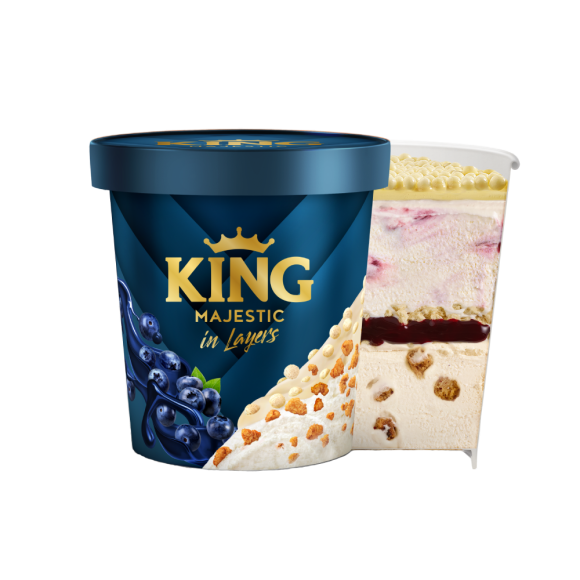 Doživite okus Kinga Majestic u čaši kroz hrskave komadiće žitarica uronjene u bijelu čokoladu te preljev od bijele čokolade. Sljedeći sloj donosi sladoled okusa cheesecakea s preljevom od borovnice, koji dodaje voćni zanos ovoj kombinaciji, dok su komadići keksa hrskavi prijelaz u daljnje uživanje. Preljevom od borovnice naglašena je osvježavajuća nota, a završni sloj okusa cheesecakea s komadićima keksa zaokružuje ovu priču i predstavlja novu razinu cheesecakea.