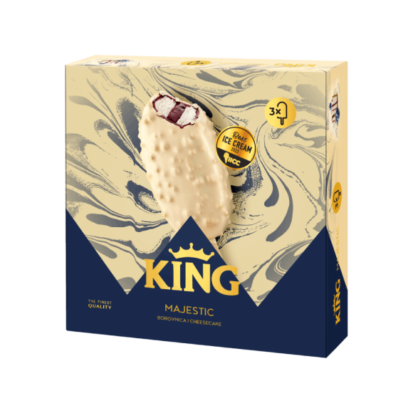 Apsolutni kralj užitka koji je obilježio ovo proljeće, neodoljiv i raskošan King Majestic, od sada je dostupan i u novom, praktičnom multipakiranju od tri komada. Dočekajte goste spremni i iznenadite ih vrhunskim ledenim desertom koji na štapiću donosi neodoljiv okus cheescakea obogaćen tekućim punjenjem od borovnice i bijele čokolade, te hrskavim posipom žitarica.