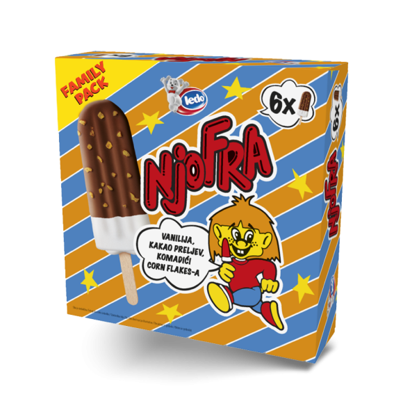 Mjesta za klasike uvijek ima! Njofra, legendarni sladoled na štapiću kojeg obožavaju i djeca i odrasli, vraća se u multipack pakiranju od 6 komada, idealnom za dijeljenje. Uz brojne uspomene iz djetinjstva Njofra je bio neizostavan dio odrastanja u osamdesetima, a sada je vrijeme i da nove generacije otkriju fantastičan okus krem sladoleda okusa vanilije s kakao preljevom i hrskavim posipom od kukuruznih pahuljica. Potražite ga i podijelite!