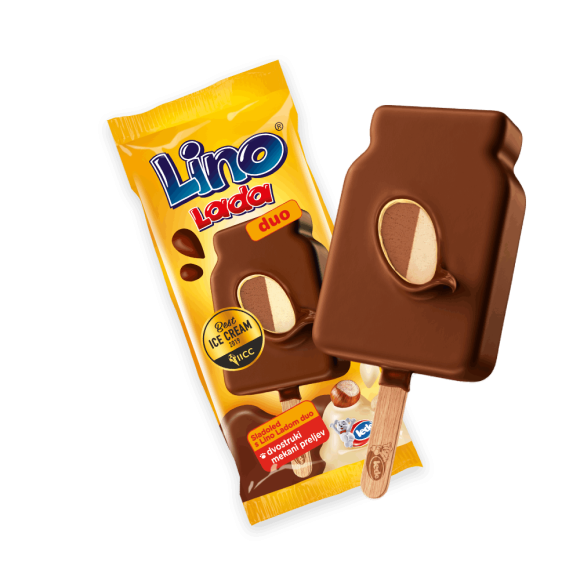 Ukusan i neodoljiv spoj lješnjaka, mlijeka i kakaa pruža duplu dozu užitka, jer je sladoled Lino Lada preliven inovativnim, mekanim preljevom okusa bijele i tamne Lino Lade.