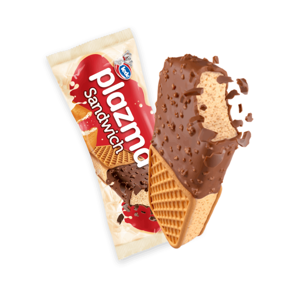 Jedinstveni sloj sladoleda okusa Plazme između dva meka biskvita obogaćen je mljevenom plazmom te prekriven finom mliječnom čokoladom s posipom krupnih komadića mljevene Plazme.