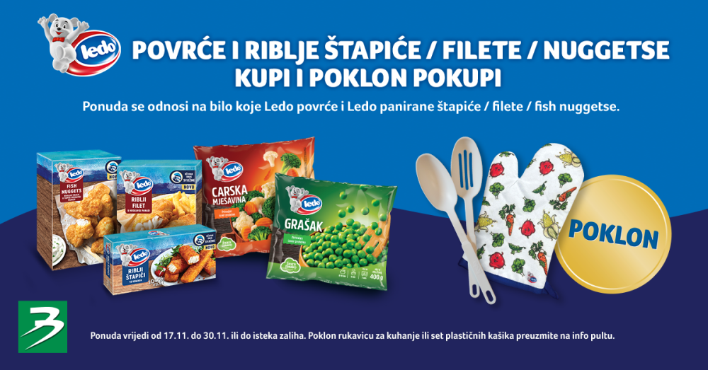 Kupite bilo koje Ledo povrće i jedne Ledo Panirane riblje štapiće 300g 100% ili jedne Panirane riblje štapiće 450g 100% ili jedan Panirani riblji filet 240g 100% ili jedne Panirane fish nuggets 245g i dobijte na dar kuhinjsku rukavicu ili set plastičnih kašika.