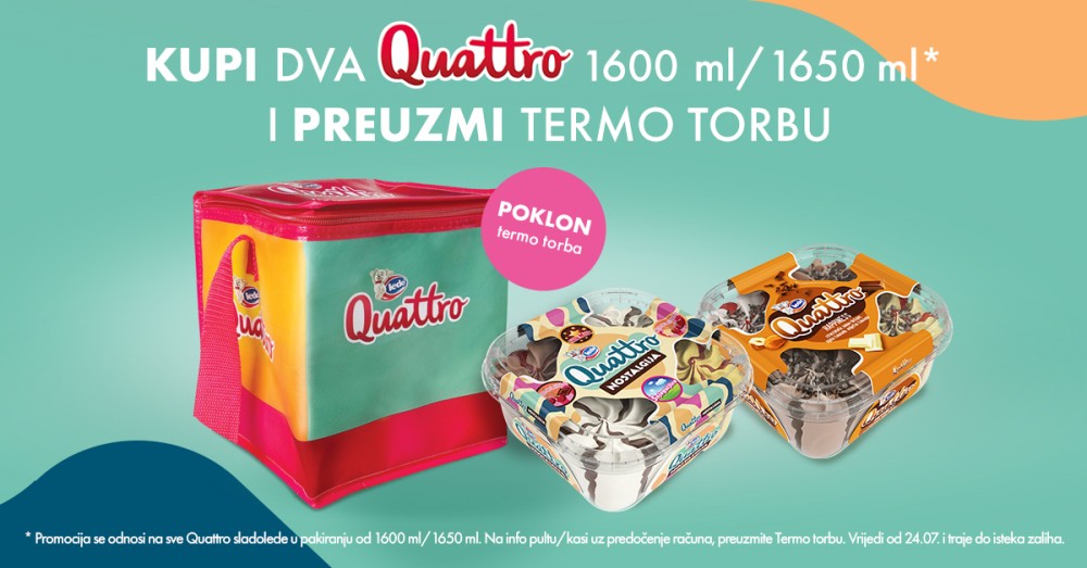 Kupite bilo koja 2 Quattro sladoleda u pakiranju od 1600 ml ili 1650 ml u trgovinama: Konzum, Mercator, Fis, Robot, Tropic i dobijte na dar Quattro termo torbu!