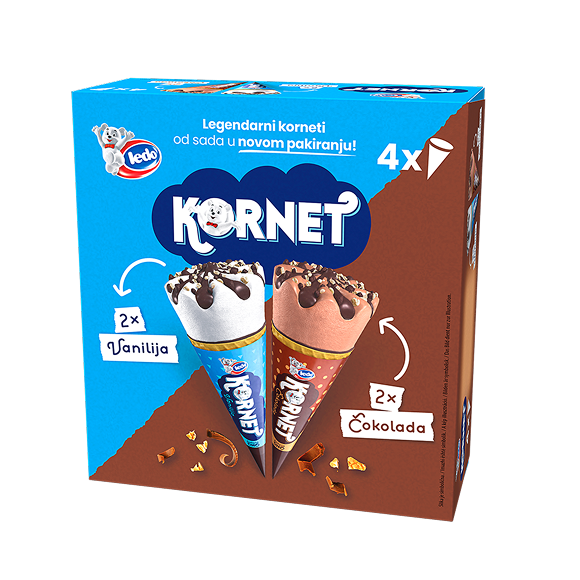 Najpoznatiji okusi legendarnih Korneta sada dolaze u praktičnom multipack pakovanju od četiri komada. Ovo pakovanje sadrži najpopularnije okuse – vaniliju i čokoladu – i idealno je za dijeljenje i uživanje s najdražima u svakom trenutku. Požurite po novi multipack i uživajte u omiljenim okusima kad god poželite.